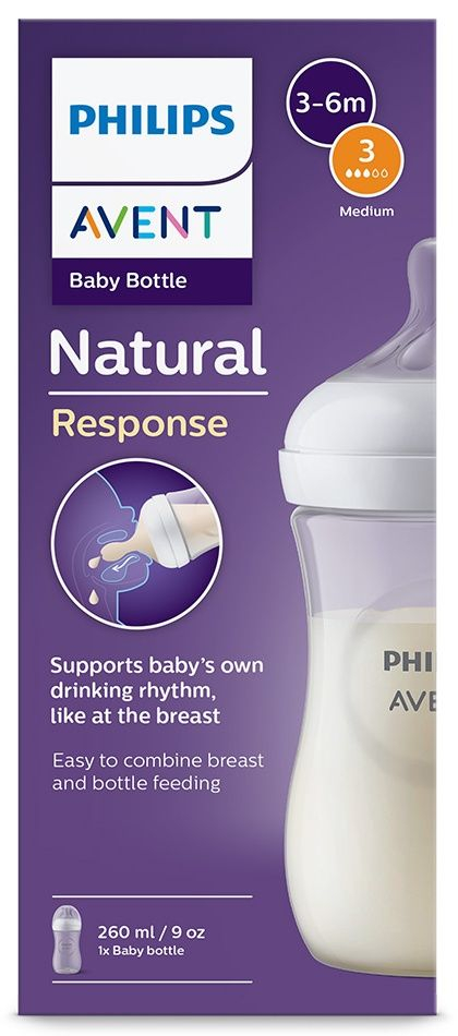 Biberon Philips Avent Natural Response , 260 ml, tetina care functioneaza ca sanul mamei, cu debit 3, tetina fara scurgeri, +3 luni, fara BPA, usor de curatat