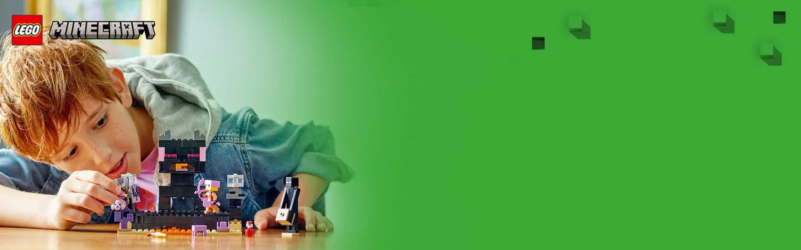 Jucătorii Minecraft aduc laolaltă un războinic din End și un arcaș dragon pentru a se lupta în legendara Arenă din End. Combatanții sunt echipați cu armură și arme, dar sunt și alte pericole de care trebuie să se ferească dacă vor să supraviețuiască. Apăsarea unui lansator aruncă blocuri de lavă din gura statuii Dragonului Ender, care se înaltă deasupra arenei, iar o podea mobilă se separă pentru a dezvălui o piscină de lavă sub picioarele rivalilor. Alte posibilități de joacă sunt inspirate de 2 mobi populari din Minecraft, un enderman și un shulker, precum și de accesorii familiare din joc, între care un morcov auriu și o poțiune. Pentru mai multă distracție digitală, aplicația LEGO Builder oferă instrumente intuitive de zoom și rotire care permit copiilor să-și vizualizeze modelul în timp ce-l construiesc.