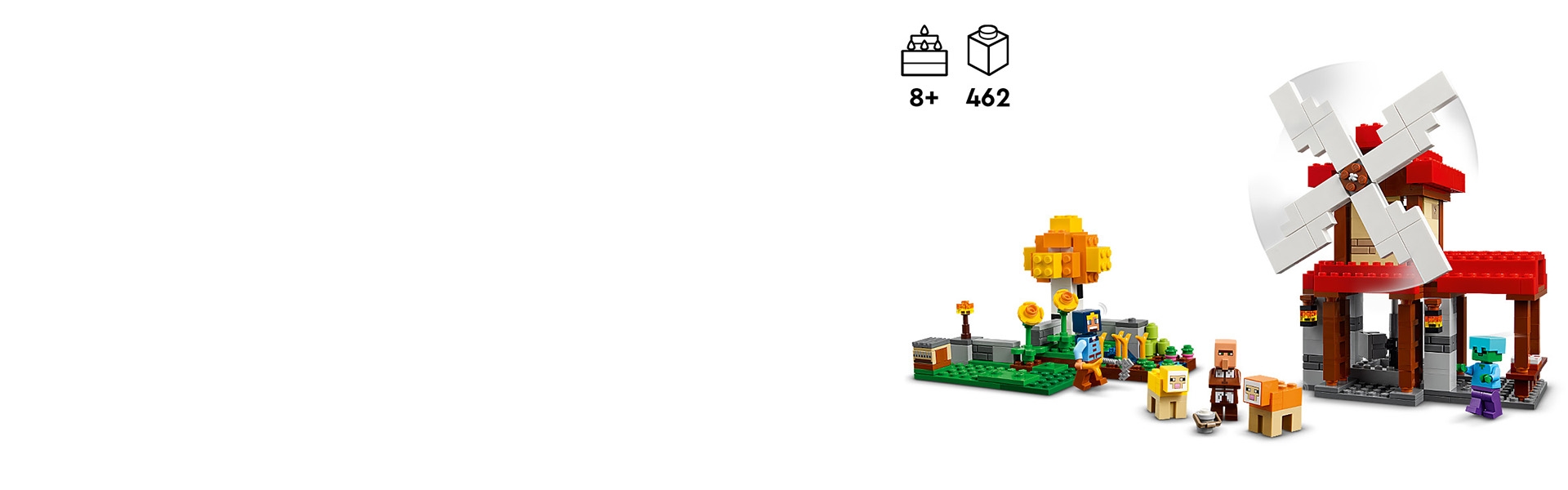 Această jucărie de construcție pentru copii conține o moară de vânt LEGO funcțională, activată prin rotirea unei roți în partea din spate. Pe când pânzele morii se învârt, piatra de moară se rotește, ca și când ar măcina grâul în făină. Ouăle, laptele și zahărul sunt la îndemâna copiilor pentru a coace pâine și prăjituri. Nivelul superior al morii de vânt oferă spațiu de depozitare pentru fân și alte provizii. Există o figurină Morar și un Sătean Cioban, care tunde oile Minecraft galbene și portocalii. Setul are și un război de țesut cu lână; orice lână în plus poate fi folosită pentru decorarea copacului. Alături de moară se află o parcelă agricolă, pe care copiii pot cultiva grâu, trestie de zahăr și sfeclă roșie. În tot acest timp, un zombi dă târcoale, așteptând să atace. Aplicația intuitivă LEGO Builder oferă constructorilor distracție digitală suplimentară.