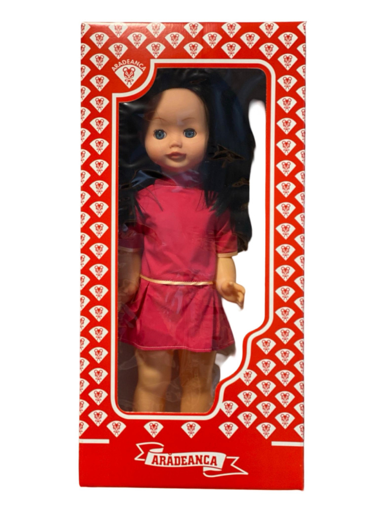 Papusa din gama Aradeanca, realizata din cauciuc gros pentru copii. Are inaltimea de aproximativ 58 de cm.