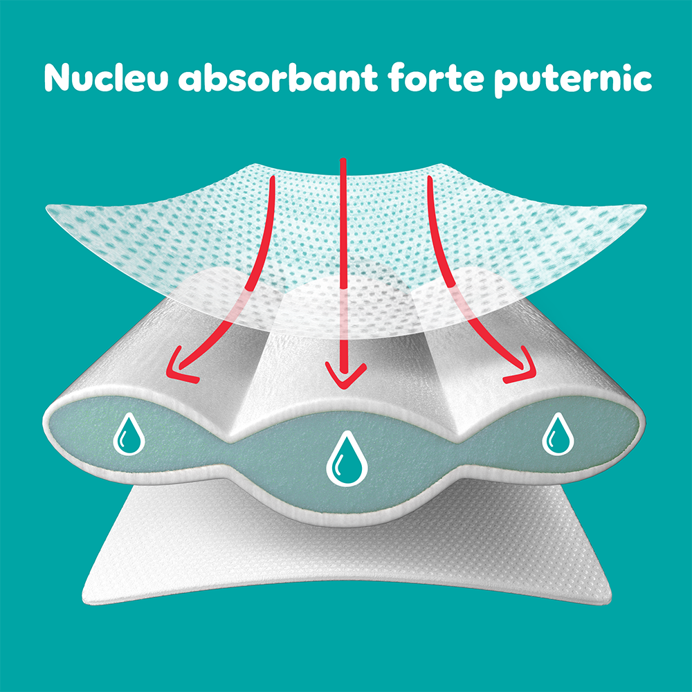 Nucleu absorbant foarte puternic absoarbe lichidul instantaneu pentru o protectie de jur-imprejur de pana la 12 ore.